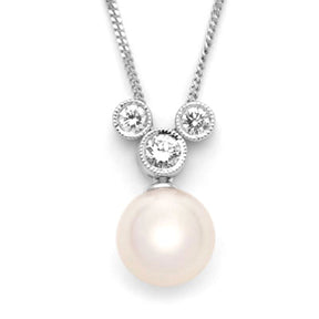 This elegant 18k white Gold pearl necklace features one light rosy pink cultured Akoya pearl and three dazzling round diamond accents. The 18k white gold Italian link chain is 17 inches in length. Pearl, the birthstone for June, makes this pendant the perfect gift for that special someone.