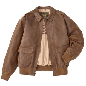 Our replica A-2 aviator bomber jacket is made to the same unyielding standards as the authentic A-2 military version. Soft, durable genuine distressed leather is sewn with dual entry pockets, plus ribbed cuffs and hem for optimal fit and comfort. Imprinted WWII U.S. flag lining. Insulated polyester filling adds extra warmth for winter.