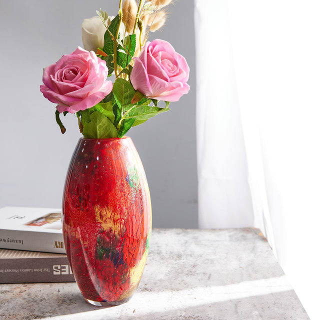 Hand Blown Sommerso Oval Art Glass Vase Red 8.5-10 inch tall