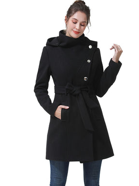 An asymmetrical front lends a high-style touch to this knee-length wool trench coat. Featuring a detachable hood, fold over collar and shapely seam detailing.